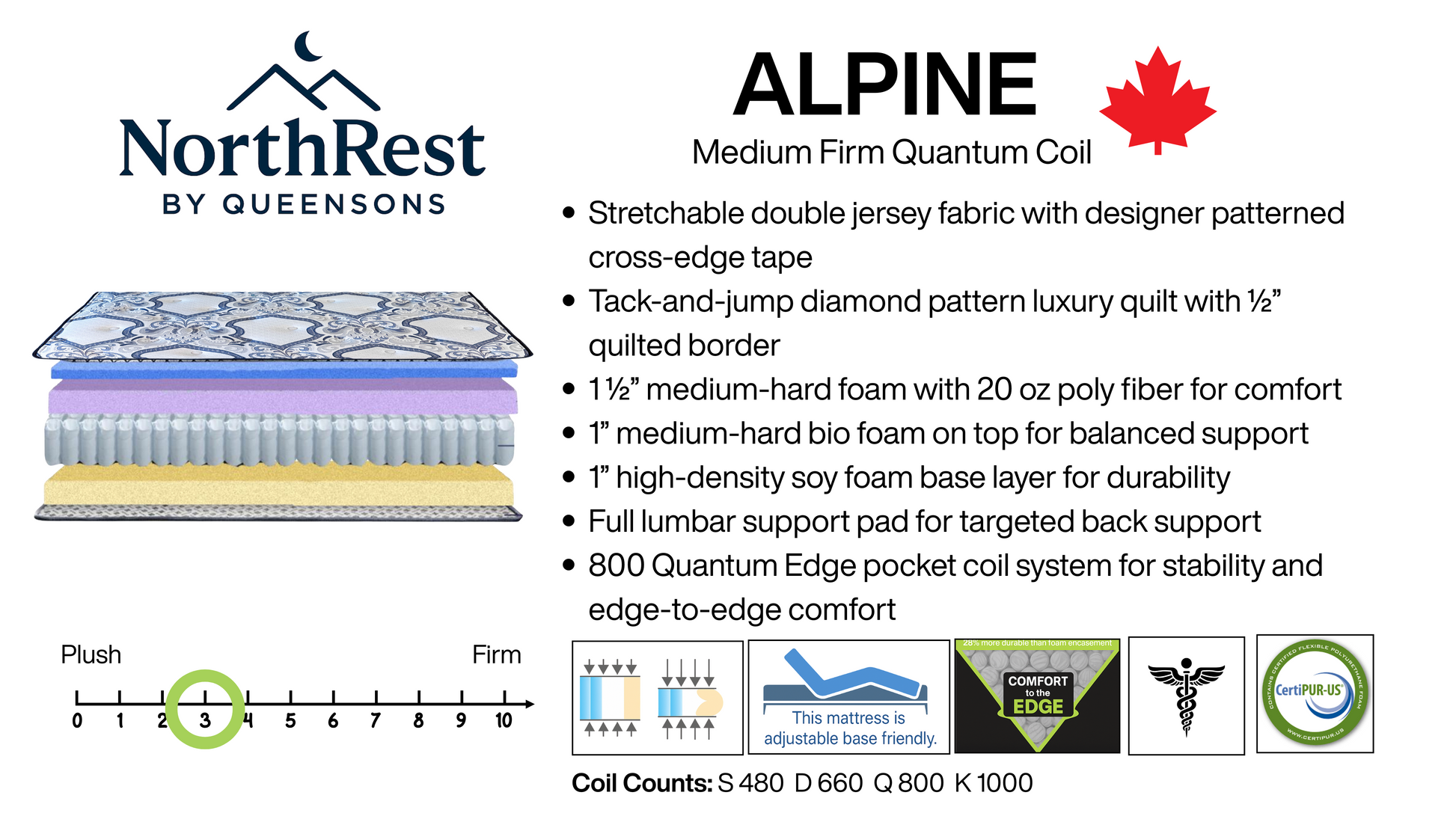 The Alpine Mattress by North Rest is built to provide balanced comfort, firm support, and long-lasting durability. Crafted in Canada, it combines premium quilting, bio-foam technology, and a Quantum Edge coil system to deliver reliable performance night after night.