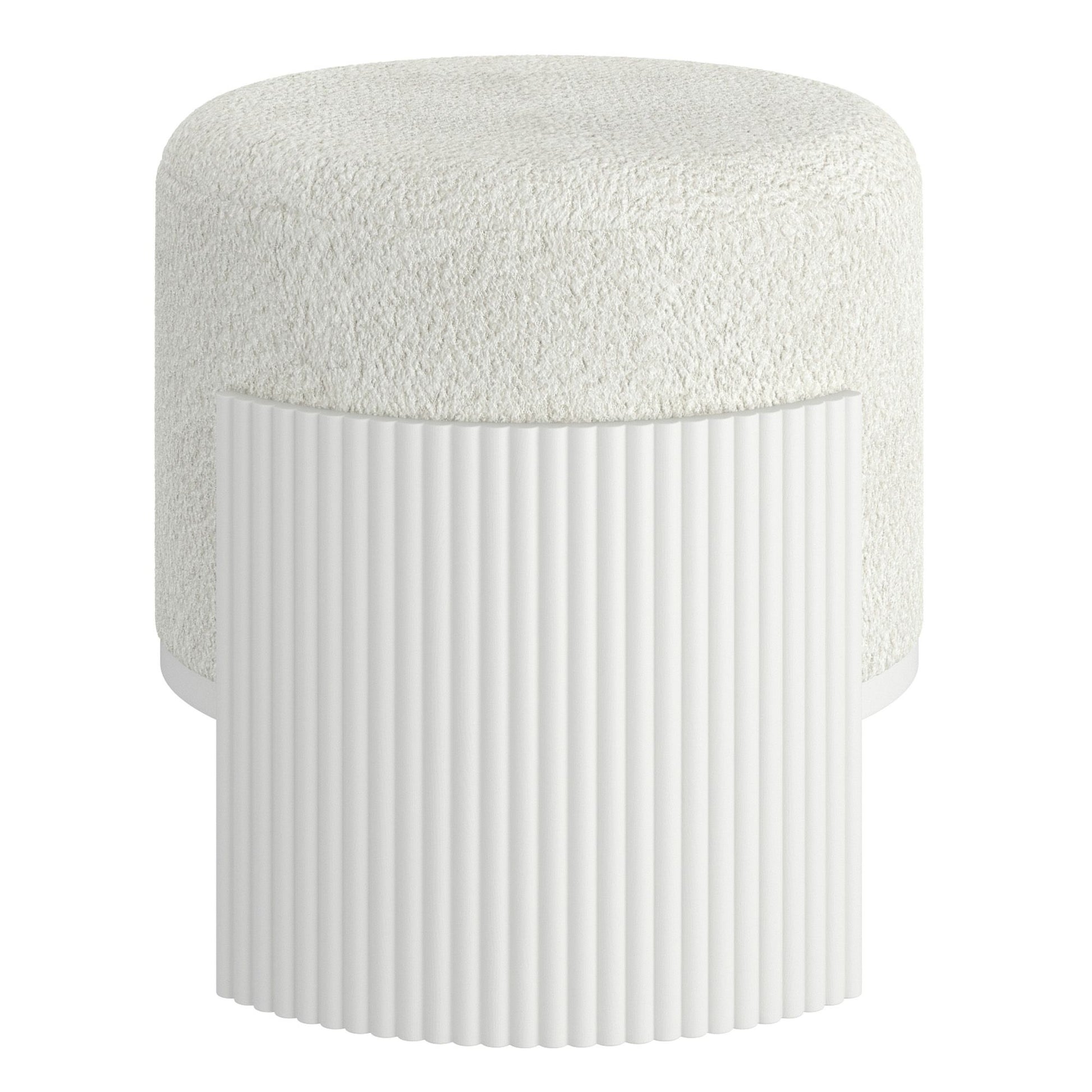 Add a touch of refined texture to your living space with this round ottoman, a perfect blend of comfort and style. Upholstered in luxurious boucle fabric, the plush top invites you to sit or rest your feet in ultimate coziness. The ottoman's standout feature is its reeded wood silhouette that wraps around the outside, offering a sophisticated contrast to the soft fabric and adding a touch of modern craftsmanship. Compact yet eye-catching, this ottoman is ideal for use as a footrest, extra seating, or a stylish accent piece that enhances any room with its blend of warmth and texture.