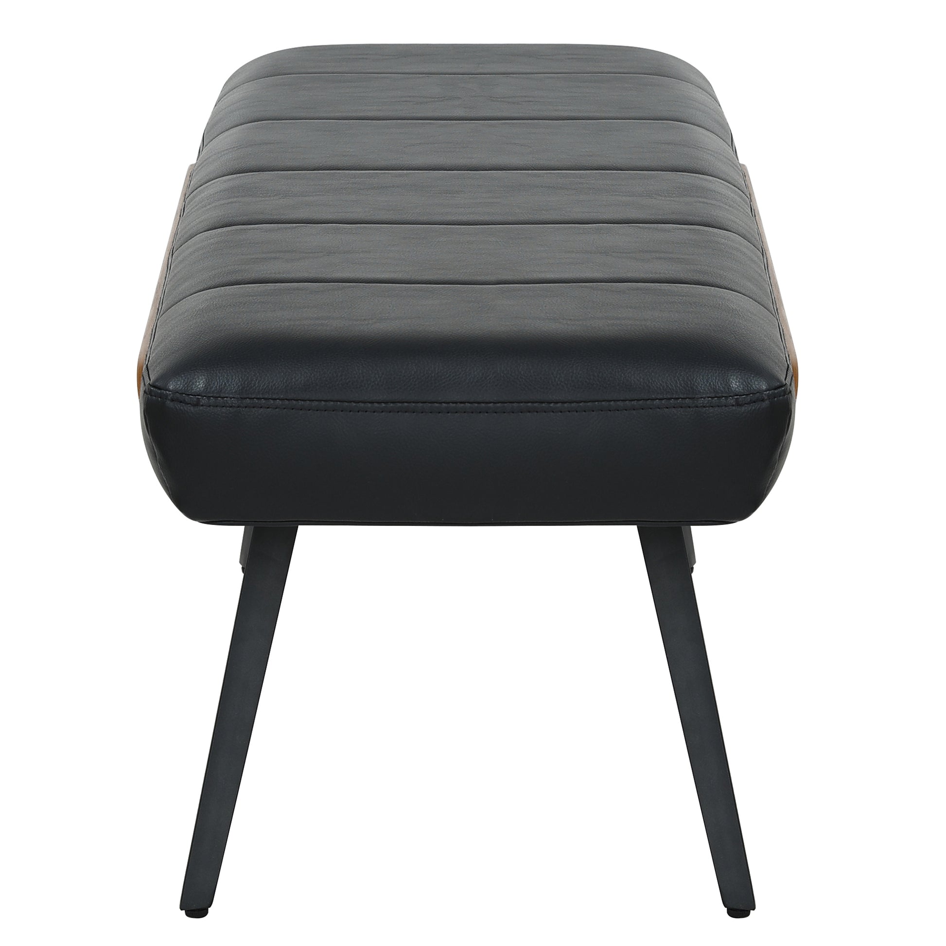 An easy bench to place in the hallway or entryway with the stitched black faux leather seat and black metal A-line legs. The solid bentwood frame in a walnut finish is a fun accent, adding some character to the clean-lined look. Comfortable seat cushion.