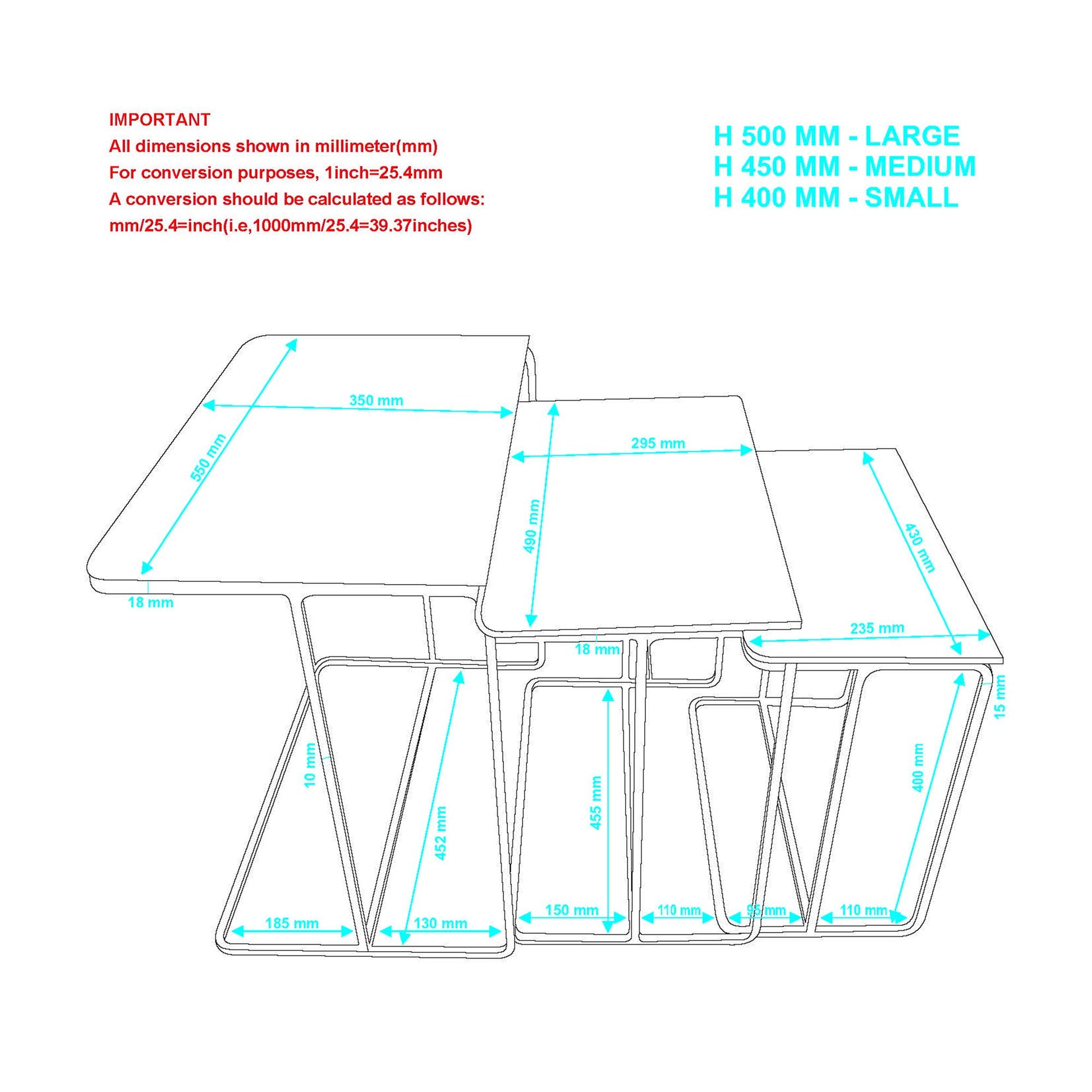 - 3-piece tables nest easily underneath each other