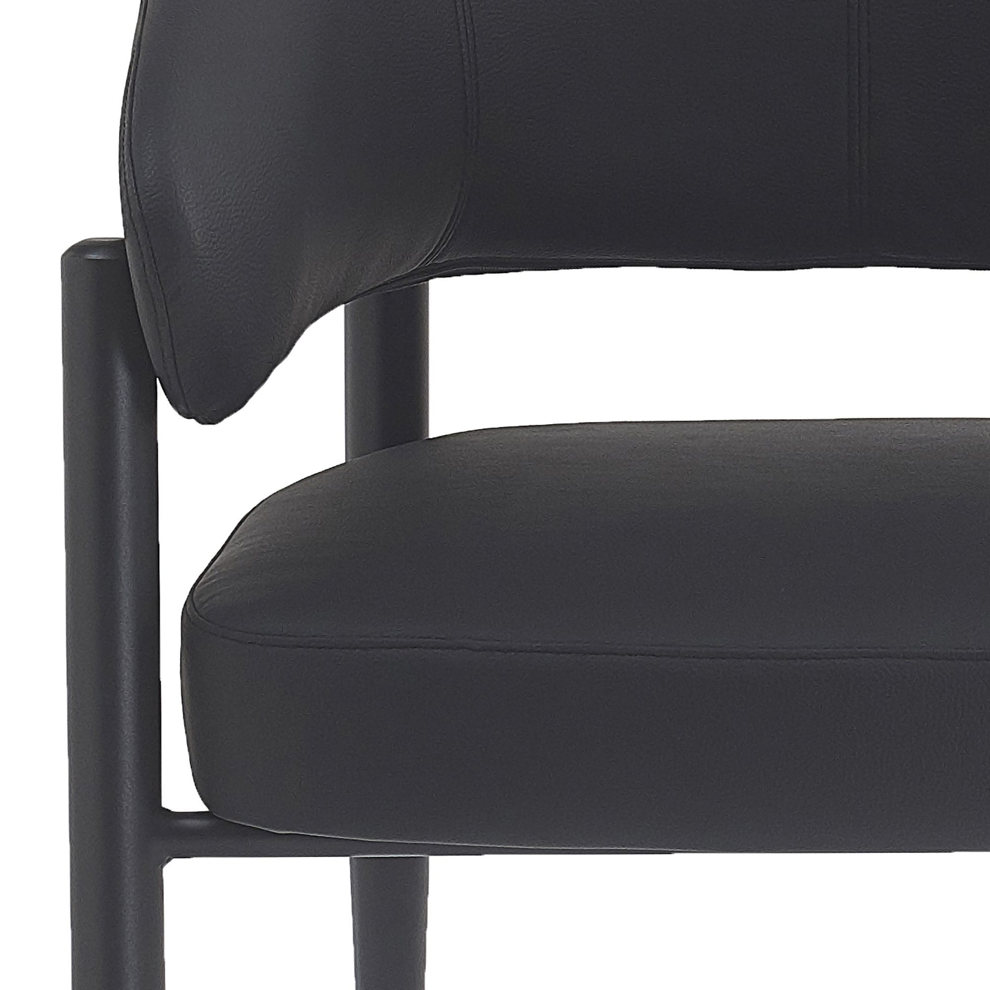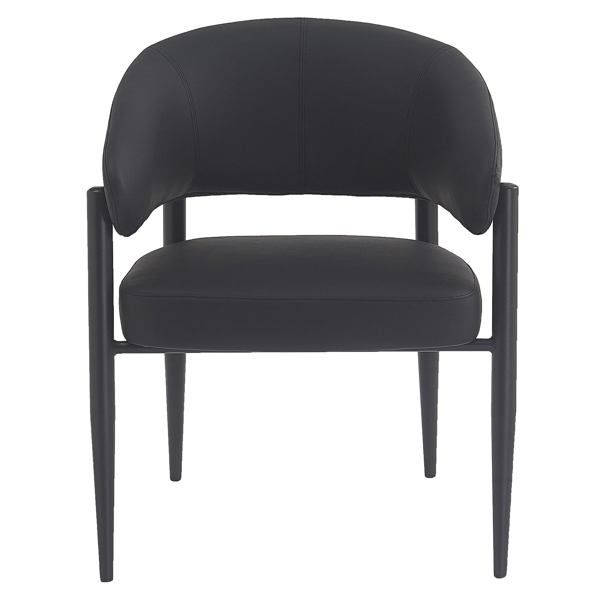 A chair that holds a commanding design presence. With the wide seat and the curved back, comfort is not even a question. The textured faux leather upholstery, and the thick black metal legs are sturdy and perfect for hours of sitting around leisurely dinners. Can work in formal dining or casual lounge settings. These chairs are suitable for residential or commercial use.