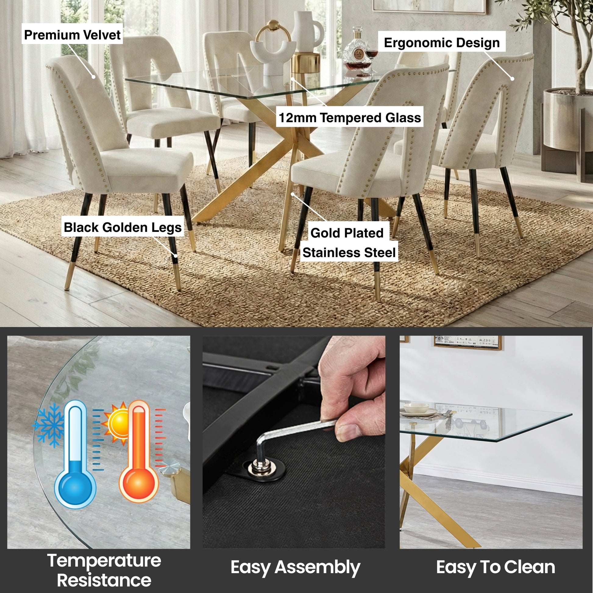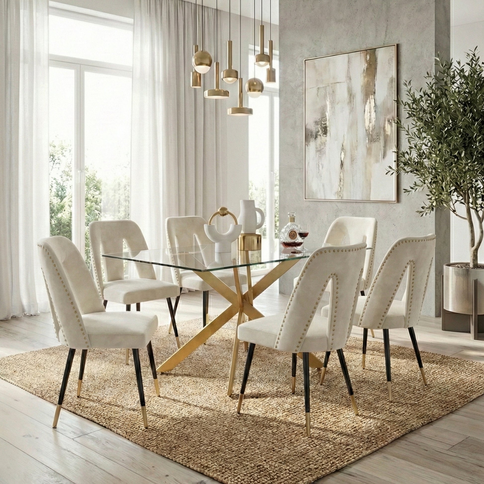 Make a bold statement in your dining space with this luxury rectangular glass dining set, featuring a 12mm tempered glass tabletop and four premium velvet nailhead chairs. The sleek glass surface creates a bright, open feel, while the gold stainless-steel base delivers striking modern elegance and superior stability. Designed for everyday dining and upscale entertaining, this set blends durability with timeless contemporary style.