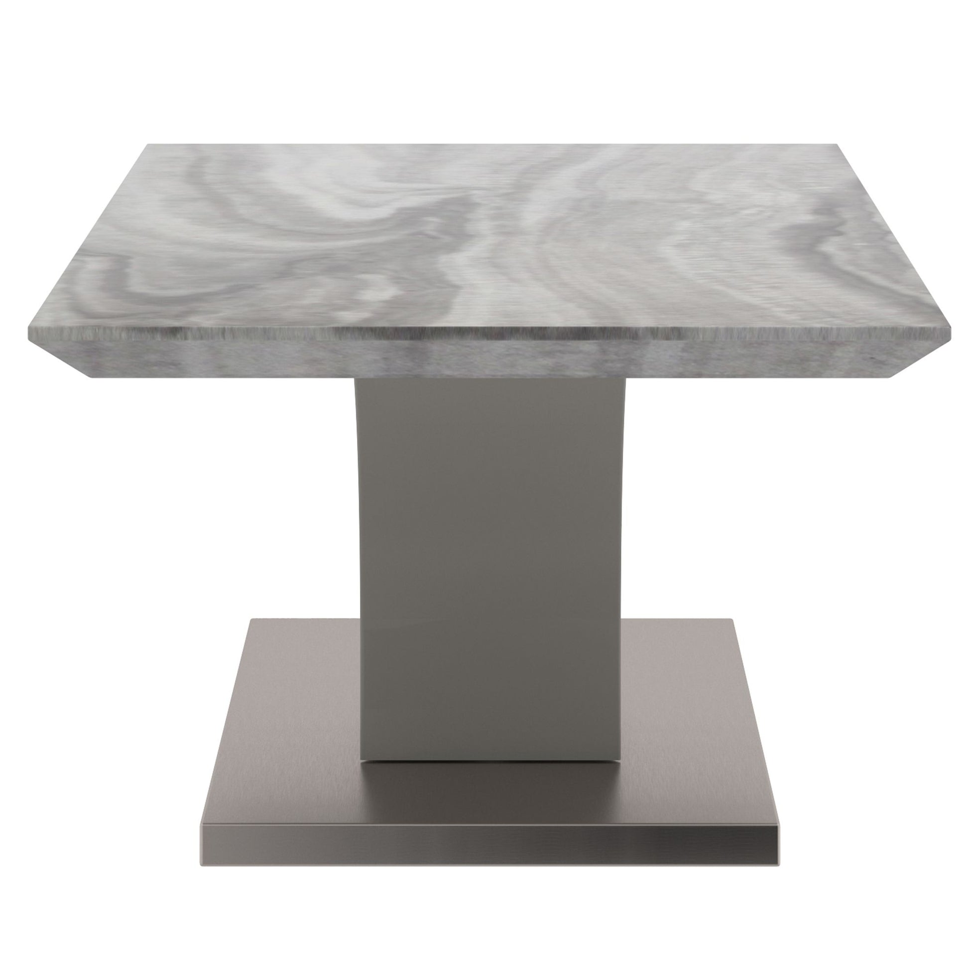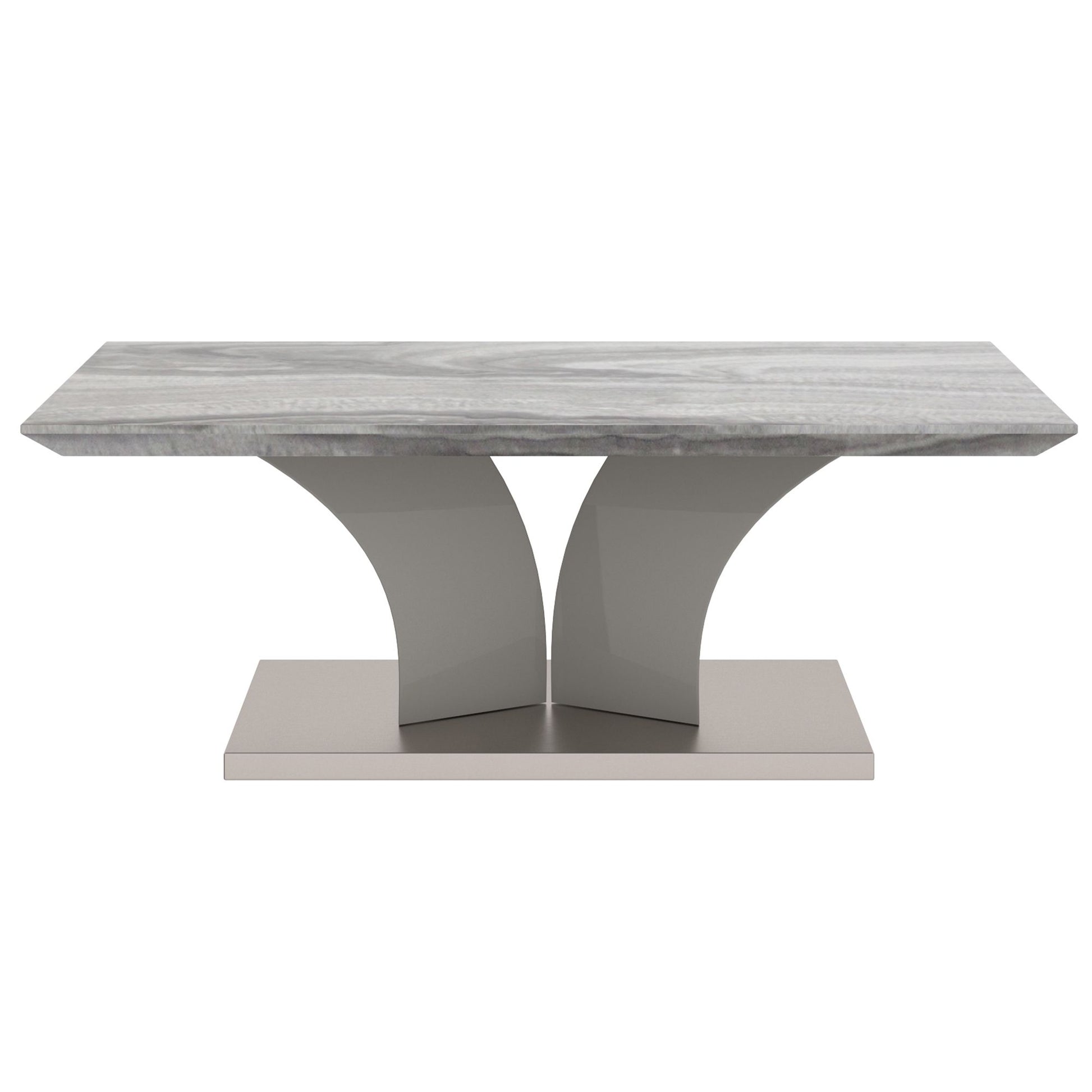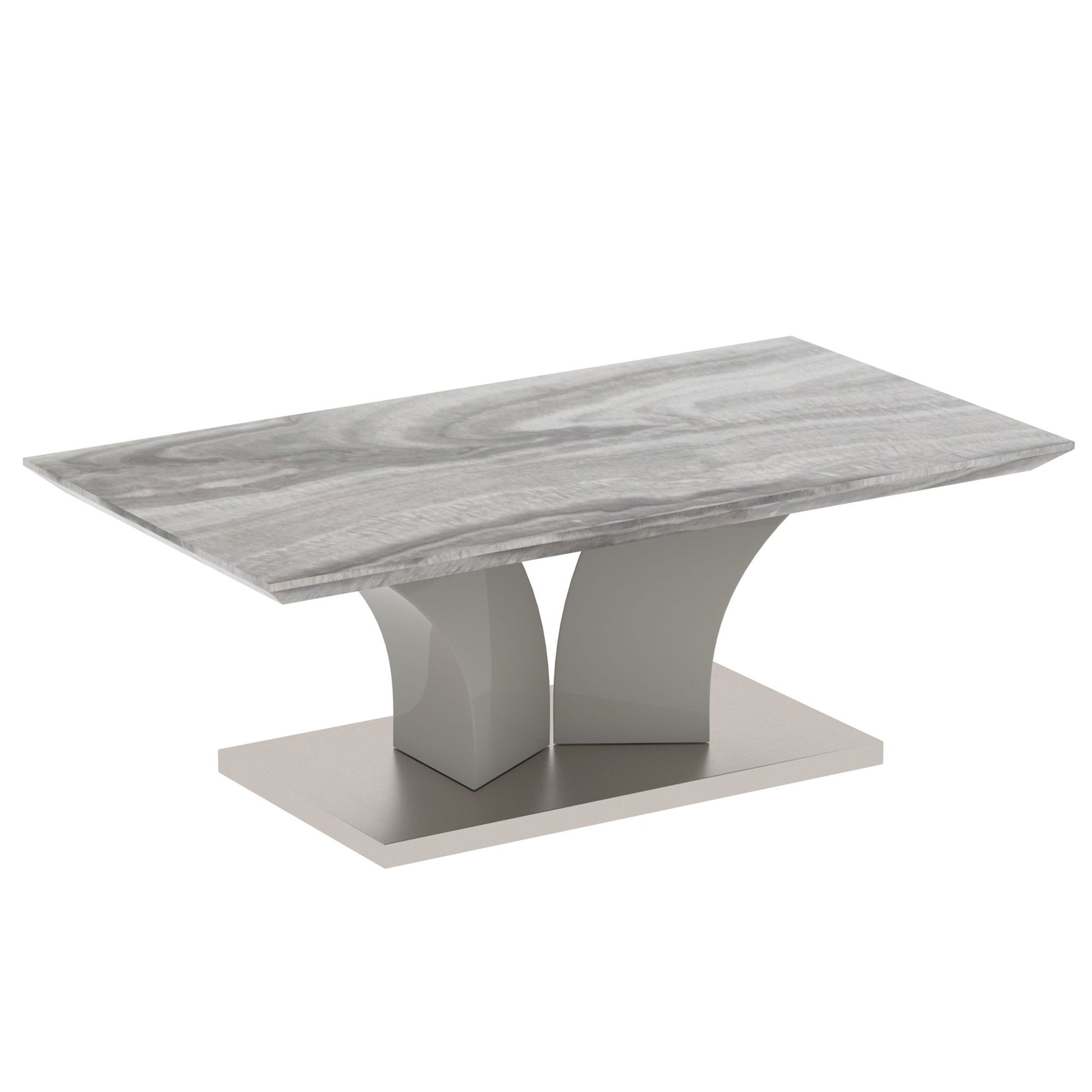 Embrace the classic look of marble and make it modern with this fun coffee table. All the finishings - from the marble-look laminated veneer to the stainless steel wrap on the base - give this piece a high end look without breaking your budget. The fun, geometric base provides plenty of visual interest and the warm grey finish allows for any easy mix with any colour scheme. Great for formal or casual living spaces.