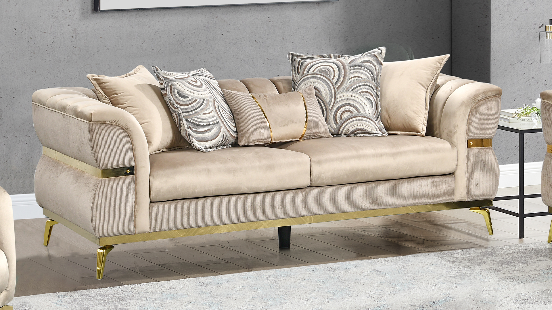 - Upholstered in soft beige velvet for a warm, versatile style