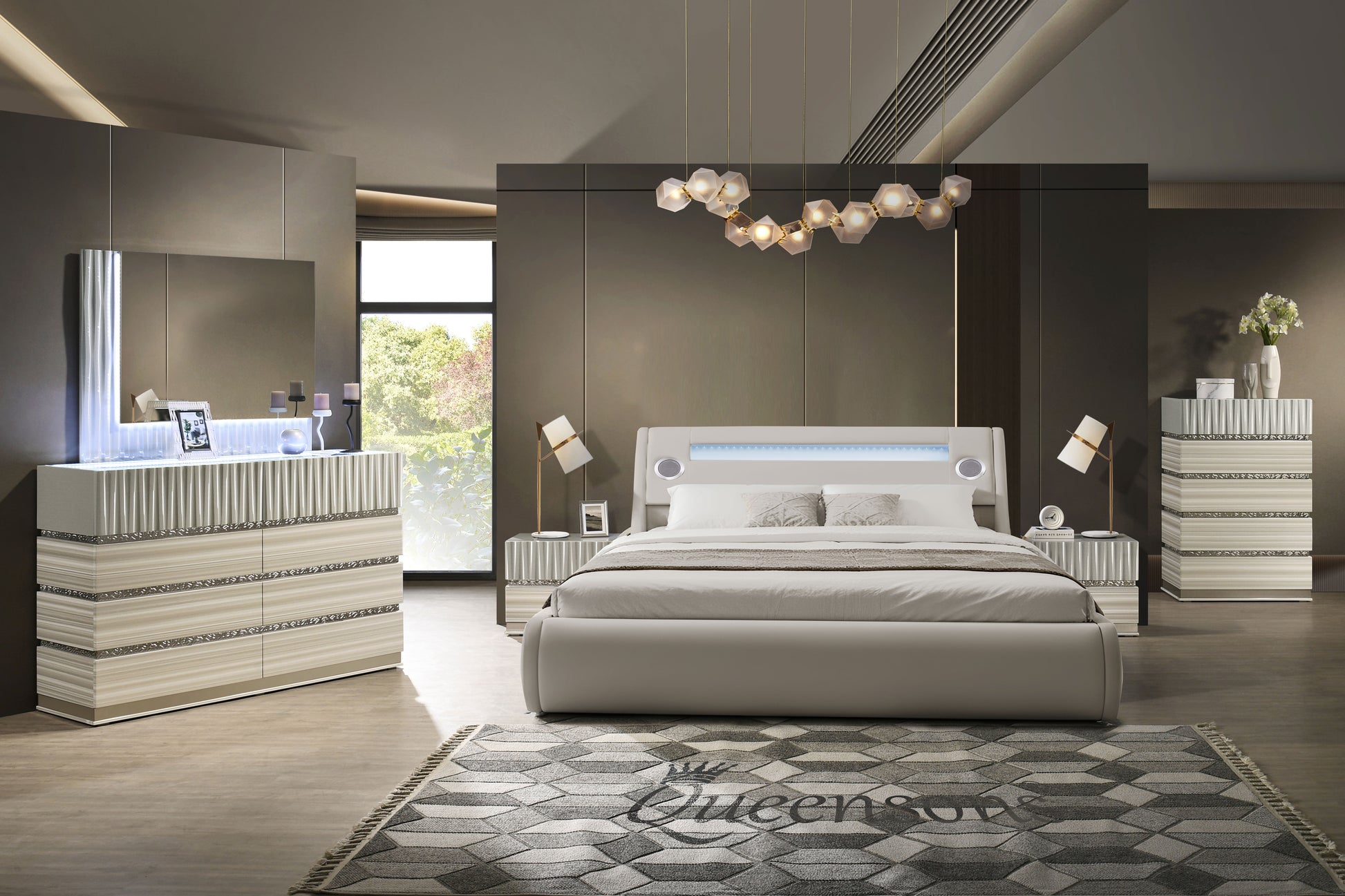The Zurich bedroom set features a sleek, modern design with clean lines, textured panel detailing, and an elegant neutral finish that complements any décor style. The upholstered headboard with subtle accent detailing adds a luxurious touch, making this set a true statement piece.