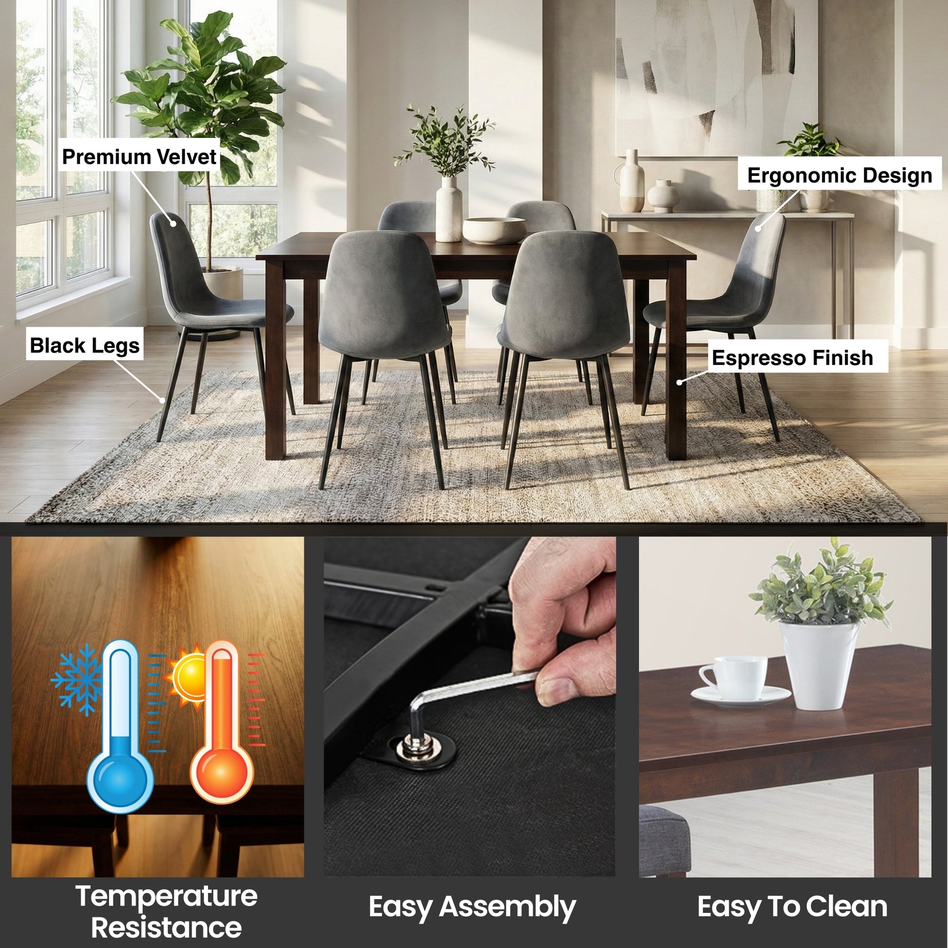 Bring home this elegant and durable espresso wood dining table set with velvet chairs and transform your dining area into a stylish, comfortable gathering space.